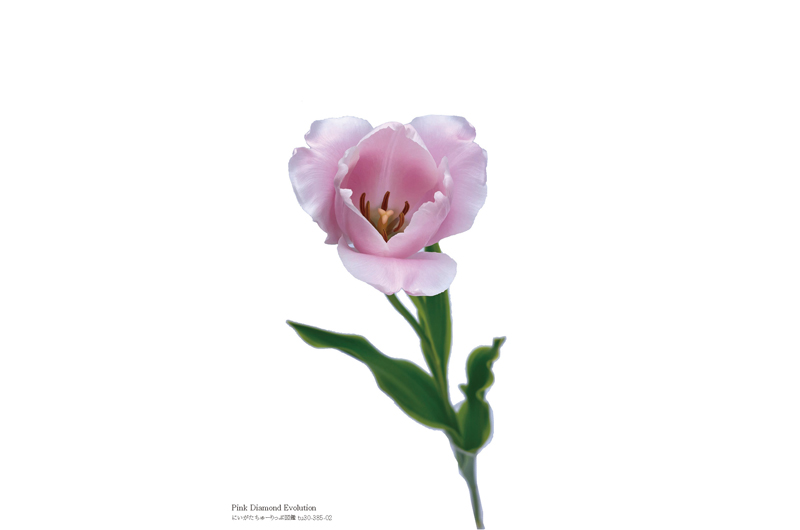 コメント:ピンクダイヤモンド(No.036)は人気ナンバーワンで最高級のチューリップ。その「ピンクダイヤモンド」を進化させた作品「エボリューション」。凛とした花姿だけでも美しいのに、葉に斑が入ることで総合的な芸術品となっている。新潟県中条の水澤勝栄氏が20年をかけて作り上げたチューリップの宝石である‼(E)